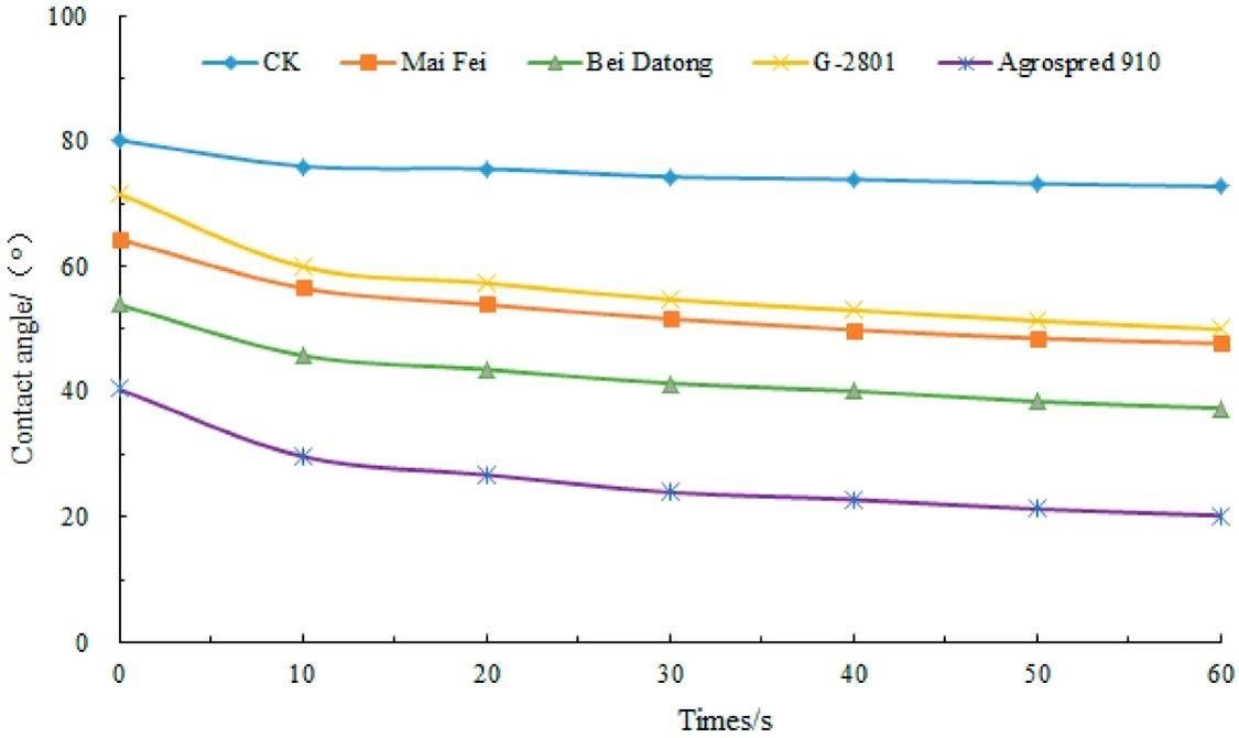 圖2.水和不同助劑溶液在荔枝葉上隨時間變化的接觸角。