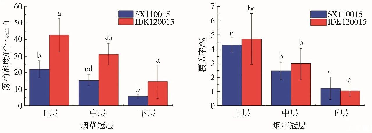 如圖4所示,與SX110015噴頭相比,IDK120015噴頭可提高藥液霧滴密度,煙草上、中、下冠層分別提高92.9%、101.6%和160.7%;在煙草上、中冠層藥液霧滴覆蓋率分別提高10.0%和20.2%,但在煙草下冠層藥液霧滴覆蓋率則降低13.8%。這是由于IDK120015噴頭孔徑小,藥液霧滴粒徑更細(xì),而SX110015噴頭的噴霧藥液霧滴的穿透性更強(qiáng)。因此,在使用時應(yīng)根據(jù)天氣條件和防治對象選擇合適類型的噴頭。