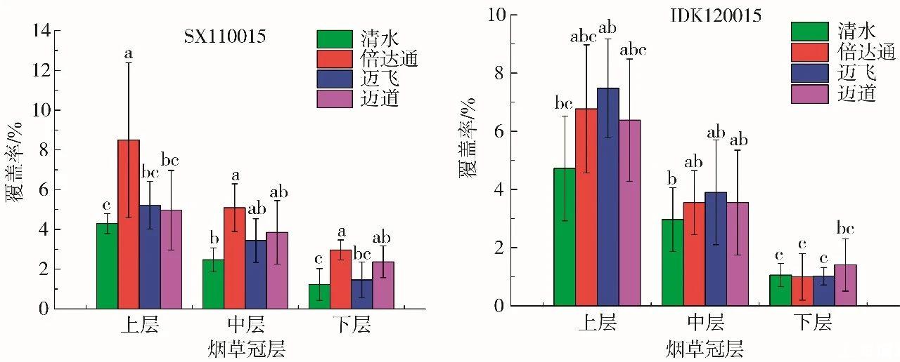 如圖3所示,采用SX110015噴霧時,添加助劑能夠顯著提高藥液霧滴在煙草上、中和下冠層的覆蓋率。其中,倍達(dá)通助劑的效果最為顯著,分別提高97.9%、106.1%和141.5%,而邁道對煙草下層的藥液霧滴覆蓋率提高92.7%。