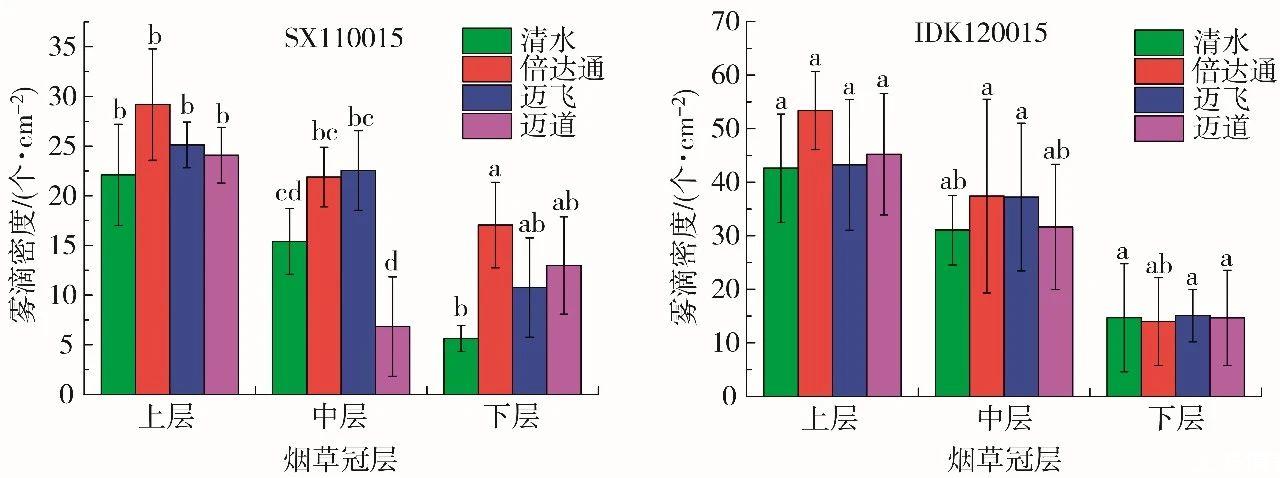 采用IDK120015噴霧時,添加助劑能夠提高藥液霧滴在煙草上、中冠層的霧滴密度。煙草上層,添加倍達(dá)通、邁飛和邁道助劑的霧滴密度分別提高25.2%、1.4%和6.1%;中層分別提高20.5%、19.9%和1.9%;下層添加邁飛助劑的霧滴密度提高2.7%,而添加倍達(dá)通和邁道助劑則分別降低4.8%和0.2%。在煙草上、中、下冠層的藥液霧滴密度均呈遞減的趨勢,下層霧滴密度分別占上層霧滴密度的26.2%、34.9%和32.4%。