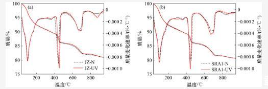 通過TG-DTG程度對比分析60 d齡期時2種環(huán)境條件下水泥水化,熱重分析結(jié)果圖6和表4所示?;瘜W結(jié)合水和氫氧化鈣的含量可以直觀地反映水化速率和水化程度。如表4所示,經(jīng)過強紫外線照射后,各組樣品的化學結(jié)合水含量和氫氧化鈣含量呈下降趨勢,這是因為強紫外線照射下樣品中的自由水會更快地蒸發(fā),最終導致水化程度降低。此外,對比2種環(huán)境下的碳酸鈣含量發(fā)現(xiàn),強紫外輻射會促進水泥石的碳化。熱重分析結(jié)果與已有的研究結(jié)果相似。