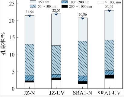 由圖7和表5可以看出:強紫外線輻射使各組樣品的總孔隙率、介孔率(2~50 nm)及大孔率(尤其是200 nm以上的孔)增加,由于彎月面的表面張力效應,介孔的毛細管產(chǎn)生更高的毛細管應力,導致暴露在強紫外輻射環(huán)境中的水泥石產(chǎn)生更大的干燥收縮。同時,經(jīng)過強紫外線照射后,樣品中大于200 nm的孔隙比例增加。這是由于強紫外線輻射環(huán)境下,水泥凈漿的水化程度降低及水分散失增加導致的。