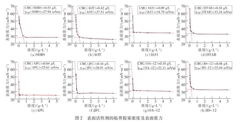 由圖2可見,8種表面活性劑溶液表面張力隨濃度變化的趨勢大體上相同,但其臨界膠束濃度及表面張力有較大差別。溶液臨界膠束濃度越小,說明表面活性劑分子在溶液中形成膠束的能力越強(qiáng)。8種表面活性劑的臨界膠束濃度主要集中在濃度為0.1~0.4 g/L左右,其中APG的臨界膠束濃度最小為0.04 g/L,SDBS的最大為0.53 g/L,8種表面活性劑形成膠束能力由強(qiáng)到弱排序為:APG>BS-12>1631>OA-12>JFC>DTAB>AOT>SDBS,總體呈現(xiàn)出兩性型>非離子型>陽離子型>陰離子型的規(guī)律。溶液的γcmc值越小,表面活性劑降低表面張力的能力越強(qiáng),陰離子和非離子型的4種表面活性劑γcmc值均較低,其中APG降低表面張力能力最強(qiáng),γcmc值僅為25.61 mN/m,比水降低了65.15%。而陽離子和兩性型的表面張力較高,均在31.00 mN/m以上,1631降低表面張力的能力最弱,表面張力為34.79 mN/m。8種表面活性劑降低表面張力的能力由強(qiáng)到弱依次排序如下:APG>JFC>AOT>SDBS>OA-12>CTAB>BS-12>1631,總體而言,非離子型>陰離子型>兩性型>陽離子型。APG的臨界膠束濃度和表面張力都最低,這可能是因為APG分子為環(huán)狀結(jié)構(gòu),環(huán)狀結(jié)構(gòu)的碳原子上連接有醇羥基,這些醇羥基與水分子之間存在強(qiáng)相互作用,且在水溶液中溶解度很高,因此有效降低了溶液的表面張力,也更易形成膠束。