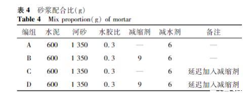 制備四組砂漿,B、D組中的水用SRA按照5%(質量分數(shù))進行替換。B組中的SRA與水混合后直接加入水泥中攪拌,A組除不含SRA外與B組一致。而C、D組分兩步混合,C組先只加入95%的水進行攪拌,完成后用塑料薄膜覆蓋攪拌鍋靜置15min,然后加入余下的水以中速攪拌3min,D組與C組唯一不同的地方在于先加入95%的水,最后加入的是余下5%的SRA,具體如表4所示。