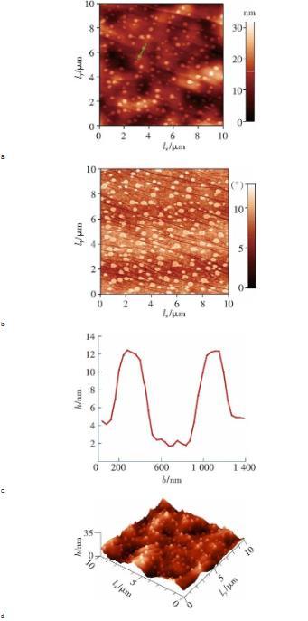 圖2a是探針在超純水中HOPG表面測得的力-位移曲線,當分離距離大于5 nm時,針尖和表面之間的作用力主要為斥力。由于實驗中的水呈弱酸性(PH約5.6),而研究表明,HOPG表面在弱酸性水中帶弱負電荷,探針針尖(單晶硅)在水中也認為是帶弱負電荷。因此,這個斥力可以解釋為雙電層(Electrostatic double layer,EDL)引起的。當分離距離小于5 nm時,在范德華力的作用下,針尖產生‘跳進’(jump in)現(xiàn)象并與HOPG表面接觸,整個力曲線符合DLVO理論。醇-水替換之后,在10 10掃描區(qū)域內采用Taping-Mode模式(95%的set-point)以1 Hz的掃描頻率,如圖3a所示,HOPG表面上生成的納米氣泡呈球冠狀,相應的三維圖如圖3d所示。