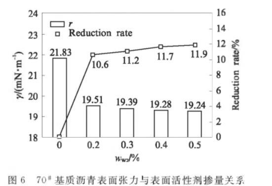使用改進(jìn)差分毛細(xì)管法,得到不同表面活性劑摻量wW2下B+W2的表面張力值,見圖6.由圖6可見:未摻表面活性劑時(shí),70#基質(zhì)瀝青表面張力為21.83mN/m,表面活性劑摻量為0.2%時(shí)B+W2的表面張力為19.51mN/m,表面張力顯著降低,降幅為10.6%;表面活性劑摻量在0.3%——0.5%,表面張力在19.24——19.39mN/m,與70#基質(zhì)瀝青相比,表面張力降幅趨緩,降低幅度為11.2%——11.9%.
