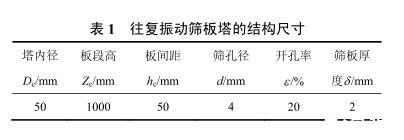 表1往復(fù)振動(dòng)篩板塔的結(jié)構(gòu)尺寸