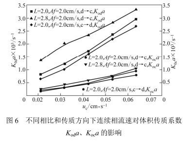 兩相流速、相比與傳質方向對體積傳質系數的影響見圖6。圖中結果顯示:分別用有機相溶質濃度和水相溶質濃度表示傳質推動力得到的體積傳質系數Koda和Koca隨著連續(xù)相流速的增加而增大,傳質方向相同(d→c)時,高相比的體積傳質系數(Koda或Koca)大于低相比的體積傳質系數。其原因主要還在于高流速和高相比的情況下,傳質相界面積a更大。