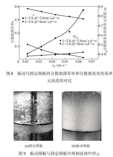 圖8給出了正丁醇-丁二酸-水體系分別在振動篩板塔與固定篩板塔中的分散相滯存率和分散相“真實”傳質單元高度的對比。圖中顯示振動篩板塔中分散相滯存率x明顯高于固定篩板塔中的x,傳質單元高度Hod遠低于固定篩板塔的Hod,而且振動篩板塔的x受連續(xù)相流速影響大,固定篩板塔的x受流速的影響微乎其微。這是由于兩種塔的萃取狀態(tài)不同(圖9),固定篩板塔的操作處于混合-澄清區(qū)[圖9(a)],振動篩板塔的操作處于分散區(qū)[圖9(b)]。