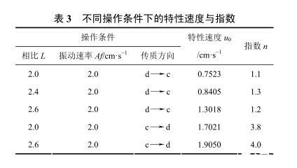 由表3中數據可以看出d→c的指數n在1.2左右,c→d的n在3.9左右,說明指數只與體系的物性有關,與操作條件無關,傳質方向不同導致指數n不同主要是有機相和水相分別作分散相的緣故。而特性速度與相比有關。由表3實驗結果可以看出,正丁醇-丁二酸-水體系的特性速度同時受兩相流速、相比和傳質方向的影響,它們都對液滴大小有影響。