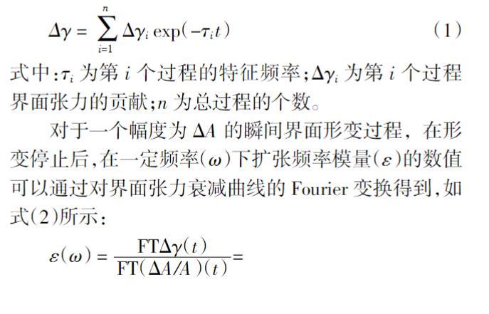 對(duì)于一個(gè)幅度為ΔA的瞬間界面形變過(guò)程,在形變停止后,在一定頻率(ω)下擴(kuò)張頻率模量(ε)的數(shù)值可以通過(guò)對(duì)界面張力衰減曲線的Fourier變換得到,如式(2)所示: