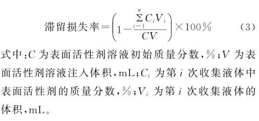 式中:C為表面活性劑溶液初始質(zhì)量分?jǐn)?shù),%;V為表面活性劑溶液注入體積,mL;Ci為第i次收集液體中表面活性劑的質(zhì)量分?jǐn)?shù),%;Vi為第i次收集液體的體積,mL。