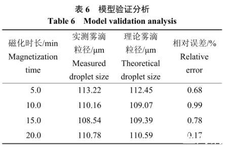 為驗證350 mT磁場強度時霧滴粒徑調(diào)控模型的實際應用價值,參考磁化除草劑溶液霧滴粒徑的試驗設計,在磁場強度為350 mT前提下,對除草劑溶液分別循環(huán)磁化5.0、10.0、15.0、20.0 min,實測霧滴粒徑與模型理論霧滴粒徑見表6,經(jīng)過分析,實測值與理論值相對誤差均小于1%,此模型具有實際應用價值。