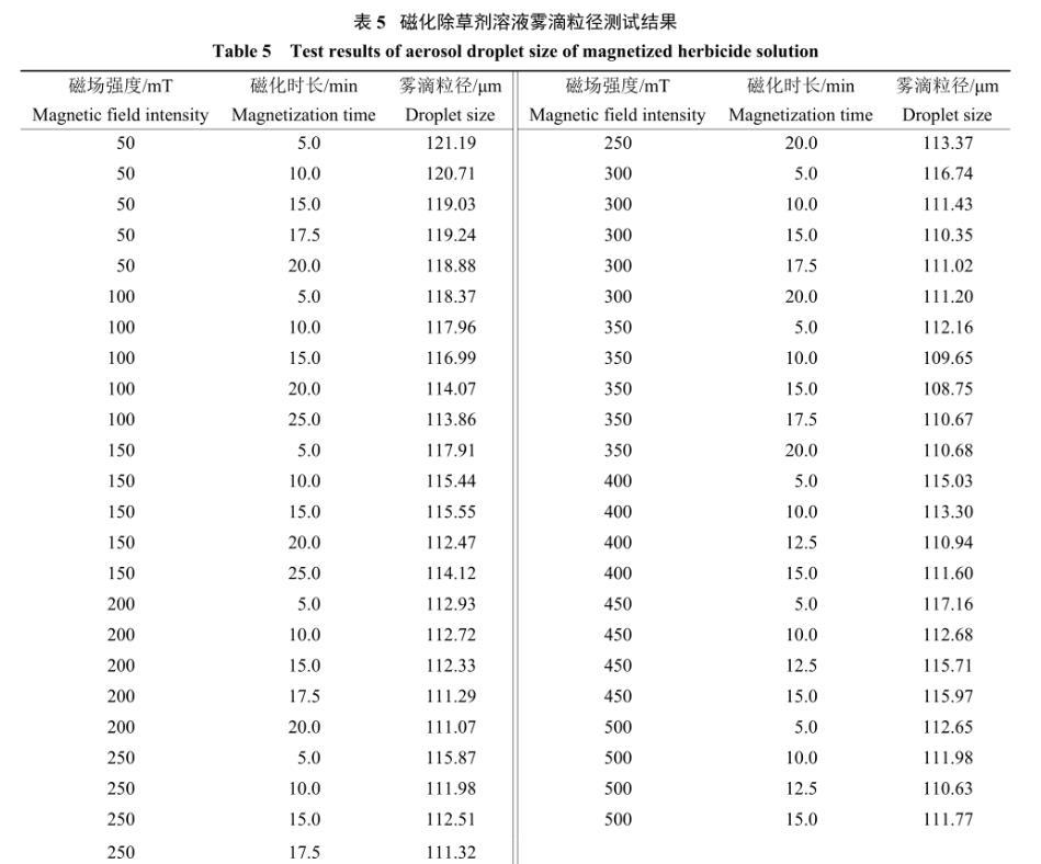 表5磁化除草劑溶液霧滴粒徑測試結(jié)果