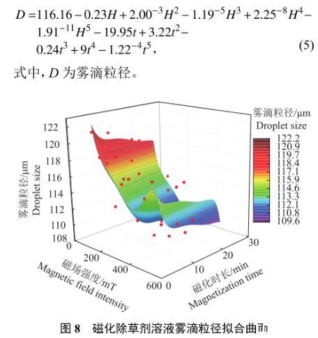 為直觀地分析霧滴粒徑變化情況,參照“2.2”表面張力數(shù)據(jù)擬合方法對噴霧霧滴粒徑進行多項式擬合、高斯擬合和洛倫茲擬合,但高斯擬合與洛倫茲擬合在達到最大迭代次數(shù)之后擬合結(jié)果仍不收斂,所以采用多項式擬合模型。多項式擬合結(jié)果中,R2為0.833 6,調(diào)整后R2為0.787 4,RMSE為2.085 7,這說明擬合函數(shù)有意義且擬合程度較高,公式(5)為除草劑噴霧霧滴粒徑與磁場強度和磁化時長的函數(shù)關系式,圖8為磁化除草劑溶液霧滴粒徑擬合曲面。