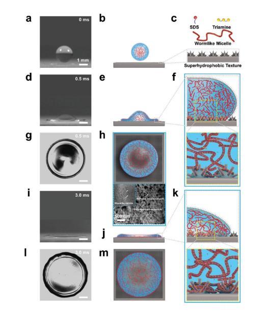 圖3.活性低聚表面活性劑高速撞擊超疏水表面后均勻鋪展的示意圖。a、b)液滴包含三維纏結(jié)的蠕蟲狀膠束網(wǎng)絡(luò)。c)SDS、三胺、蠕蟲狀膠束和具有微/納米結(jié)構(gòu)的超疏水表面的示意圖。d–h)表面活性劑分子快速擴(kuò)散到新形成的界面,并緊密堆積在水-空氣界面。蠕蟲狀膠束被迫伸展以固定水。在快速擴(kuò)散過(guò)程中,擴(kuò)散邊緣穩(wěn)定且均勻。h)蠕蟲狀膠束的密集網(wǎng)絡(luò)纏繞著基底的微納米結(jié)構(gòu),三胺/SDS液滴撞擊后的低溫掃描電鏡圖像支持了這一觀點(diǎn),其中較大的圖像顯示了較小圖像底部的網(wǎng)絡(luò)。f)表面活性劑分子與基質(zhì)具有很強(qiáng)的相互作用,蠕蟲狀膠束網(wǎng)絡(luò)與基質(zhì)的微/納米結(jié)構(gòu)纏繞在一起。i–m)在最終平衡狀態(tài)下,致密的蠕蟲狀膠束存在于擴(kuò)散外圍并與微/納米結(jié)構(gòu)纏繞在一起。左欄中所有液滴的比例尺均為1毫米。