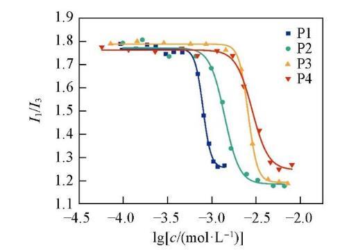 由圖3可見,當表面活性劑的濃度較低時,I1/I3在1.70——1.80之間波動;當表面活性劑濃度逐漸增加至cmc時,I1/I3值急劇下降,說明表面活性劑分子開始形成膠束,使得芘分子轉移至疏水膠束內(nèi),芘分子所處的環(huán)境極性發(fā)生突變;在較高表面活性劑濃度下,I1/I3值趨于穩(wěn)定,這是由于芘分子已經(jīng)完全處于膠束中,所處的環(huán)境極性不再發(fā)生變化。通過Boltzmann方程擬合得到表面活性劑P1,P2,P3和P4的cmc值分別為7.96×10-4,1.39×10-3,2.57×10-3和2.85×10-3 mol/L。結果表明,隨著聚氧乙烯鏈長度的增加,cmc逐漸增大。采用熒光法測得的cmc與采用表面張力法測得的cmc數(shù)值接近且變化趨勢一致。