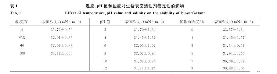 表1溫度、pH值和鹽度對生物表面活性劑穩(wěn)定性的影響