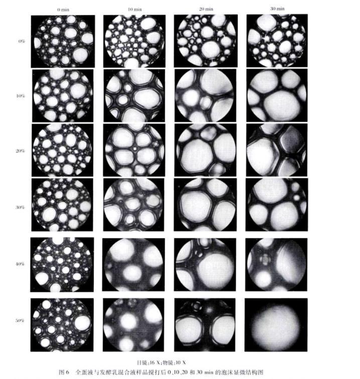 圖6為全蛋液與不同量的ST5-24 h發(fā)酵乳混合物經(jīng)過攪打后的泡沫放置0、10、20和30 min時的顯微結(jié)構(gòu)圖,其中目鏡和物鏡的放大倍數(shù)分別為16 X和10 X。由圖6可以看出,在0 min時,發(fā)酵乳含量為0%~30%的氣泡小而稠密,而40%和50%的氣泡大小不一且稀疏,說明混合液的起泡性在發(fā)酵乳含量大于30%時開始降低。此外,在發(fā)酵乳含量較少時,氣泡之間連接比較緊密;而發(fā)酵乳含量較高,尤其是在發(fā)酵乳含量為50%時,氣泡呈分散狀態(tài),并且在氣泡底部有少量析出的液體(圖中灰色部分)。