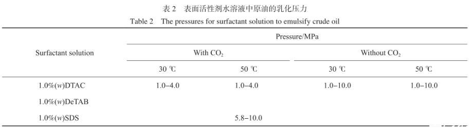 實驗中觀察到原油的乳化情況與體系壓力及CO2存在與否的相關(guān)性,表2是CO2存在與CO2不存在條件下,1.0~10.0 MPa范圍內(nèi),表面活性劑水溶液中原油的乳化壓力。50℃時,在DTAC水溶液/原油體系中,CO2不存在時,水靜壓在1.0~10.0 MPa范圍內(nèi),始終存在原油的乳化現(xiàn)象。CO2存在時,體系壓力低于4.0 MPa時,存在原油的乳化現(xiàn)象,隨著CO2壓力升高,油水界面張力增大,原油乳化現(xiàn)象消失。說明在DTAC水溶液/原油體系中,CO2的存在不利于原油的乳化。50℃時,在SDS水溶液/原油體系中,CO2不存在時,水靜壓從1.0 MPa升高至10.0 MPa過程中,始終未出現(xiàn)原油的乳化現(xiàn)象。CO2存在時,體系壓力升高到5.8 MPa以上,原油開始出現(xiàn)乳化、拉絲的現(xiàn)象。這說明CO2的存在有利于SDS水溶液乳化原油。其原因如下:一方面CO2的存在降低了SDS水溶液與原油的界面張力;另一方面,CO2通過水相擴(kuò)散進(jìn)入原油中,降低了原油的黏度,增強(qiáng)了原油的流動性,同時CO2對原油中輕質(zhì)組分的萃取,也有助于原油中的輕質(zhì)組分?jǐn)U散進(jìn)入水相。因此高壓CO2增強(qiáng)了SDS水溶液對原油的乳化作用。在DeTAB水溶液/原油體系中,油水界面張力較大,無論CO2存在與否,始終沒有原油乳化現(xiàn)象的發(fā)生。