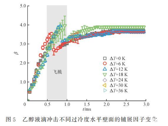 為了探究水平壁面過(guò)冷度對(duì)液滴沖擊的影響機(jī)制,定義無(wú)量綱鋪展因子β=D(t)/D0,其中D(t)為液滴每一時(shí)刻的直徑,Dmax為液滴能達(dá)到的最大鋪展直徑,對(duì)應(yīng)的最大鋪展因子為βmax=Dmax/D0。圖5展示了不同水平壁面過(guò)冷度下,乙醇液滴沖擊水平壁面的鋪展因子β隨時(shí)間的變化曲線??梢钥闯觯掖家旱螞_擊不同過(guò)冷度水平壁面均在1.0ms內(nèi)發(fā)生破碎-飛濺,在這段時(shí)間內(nèi),鋪展速率近似為線性,在飛濺后,β突然減小,隨后鋪展因子繼續(xù)增,鋪展速率逐漸減小,最終趨于0,液滴形態(tài)不再發(fā)生變化。