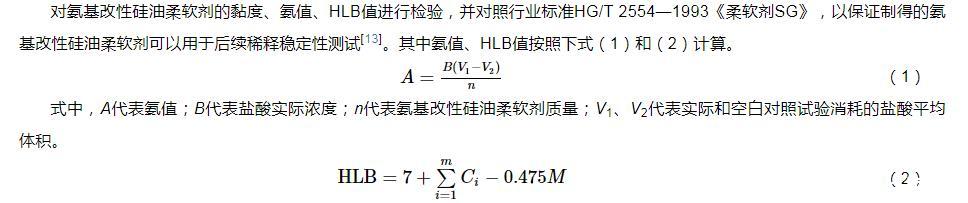 對氨基改性硅油柔軟劑的黏度、氨值、HLB值進行檢驗,并對照行業(yè)標準HG/T 2554—1993《柔軟劑SG》,以保證制得的氨基改性硅油柔軟劑可以用于后續(xù)稀釋穩(wěn)定性測試。其中氨值、HLB值按照下式(1)和(2)計算。