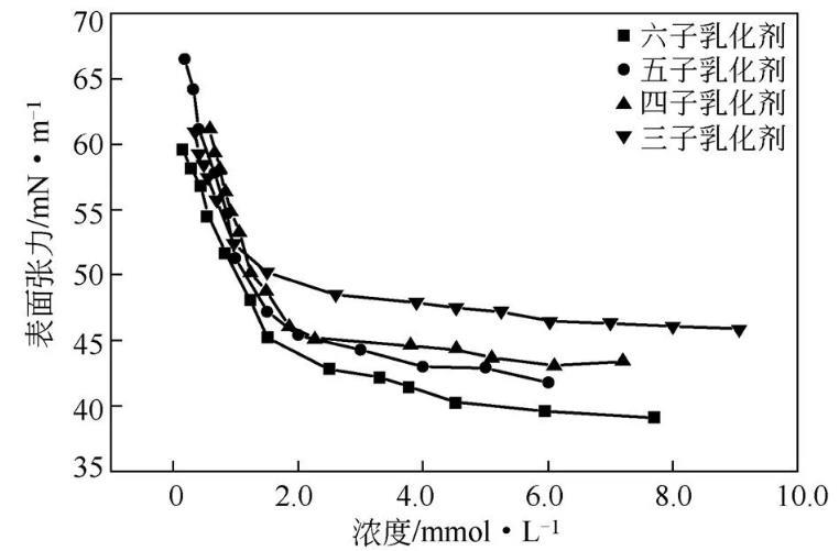 圖5多子乳化劑的表面張力-濃度曲線