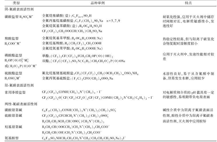 通過將短鏈氟碳表面活性劑進(jìn)行優(yōu)選和整理,可以清晰地看出,目前有四種類型:①短鏈陰-氟碳表面活性劑常以磺酸鹽和羧酸鹽為合成原料,這是由于兩者本身就具有良好的穩(wěn)定性和親水性,引入氟原子后可以使其發(fā)揮出更大的性能優(yōu)勢;②短鏈陽-氟碳型化合物的制備原料多為全氟季銨鹽類,它可以不受pH值影響,且與其他碳?xì)浠衔锏膹?fù)配協(xié)同性較好,非常具有工業(yè)應(yīng)用的價值;③短鏈兩性-氟碳型化合物中,甜菜堿類型比常規(guī)碳?xì)浠衔锏幕钚愿?,同時它的寬等電點也在一定程度上增加了它的pH適用范圍,且應(yīng)用成本不高,生物降解性好,所以同樣具有很大商業(yè)開發(fā)價值;④短鏈非離子-氟碳表面活性劑在水溶液中為非離子狀態(tài),故穩(wěn)定性高,不受pH值影響,可適應(yīng)強酸堿性的環(huán)境,并且與碳?xì)浠衔飶?fù)配后的協(xié)調(diào)性良好。但當(dāng)前所報道的非-氟碳表面活性劑多為長鏈結(jié)構(gòu),不利于環(huán)境的可持續(xù)發(fā)展,建議應(yīng)加快短鏈結(jié)構(gòu)研發(fā)和應(yīng)用的研究步伐。各種離子類型氟碳表面活性劑及其特性見表1。