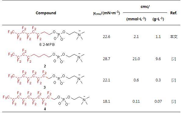 我們將文獻中的氟磷酸膽堿進行對比,如表2所示,6:2-MPB與化合物2、3、4對比,疏水鏈段含氟量越高(2<6:2-MPB<3<4),降低表面張力的能力越強,即γcmc越低。然而,對比化合物4與帶有氟醚疏水鏈段的C72-MPB,發(fā)現(xiàn)化合物4的含氟量大于C72-MPB,但4(γcmc=18.1 mN/m)的γcmc卻大于C72-MPB(γcmc=17.1 mN/m)。含有氟醚鏈段的C72-MPB降低表面張力的能力更強,我們認為氧原子的插入使膠束結(jié)構(gòu)排布發(fā)生改變,是影響表面張力的主要因素。