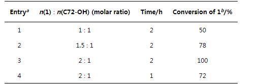 我們將原料1和C72-OH等物質(zhì)的量比混合,以超干四氫呋喃(THF)為溶劑,在0℃下進行反應(yīng),2 h后通過核磁氫譜(1H NMR)觀測到有產(chǎn)物生成。但原料C72-OH的轉(zhuǎn)化率僅為50%(表1,Entry 1)。因此,我們對反應(yīng)物的比例、反應(yīng)時間做進一步優(yōu)化。結(jié)果顯示:在原料1與原料C72-OH物質(zhì)的量比為2∶1,反應(yīng)時間為2 h的條件下,原料C72-OH可完全轉(zhuǎn)化(表1,Entry 3)。接下來,我們將中間體C72-P與3 equiv.三甲胺(2 mol/L in THF)溶解在乙腈中,在70℃下反應(yīng)48 h,高產(chǎn)率得到目標產(chǎn)物C72-MPB.用類似方法合成了結(jié)構(gòu)相似的氟碳表面活性劑6:2-MPB(表2),并對比了C72-MPB與6:2-MPB的表面活性性能。