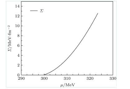利用薄壁近似,圖2給出了當(dāng)T=Tc時(shí),夸克強(qiáng)子一級相變的表面張力隨夸克化學(xué)勢的變化??芍谝患壪嘧儏^(qū)域,當(dāng)化學(xué)勢增大時(shí),強(qiáng)子相的表面張力也隨著化學(xué)勢增大。當(dāng)溫度接近零時(shí),強(qiáng)子夸克相變的表面張力約為12.6 MeV/fm2.在T→0的情況,本文理論預(yù)言與文獻(xiàn)一致,但該文獻(xiàn)只是考慮T=0的冷夸克物質(zhì)的夸克強(qiáng)子一級相變。