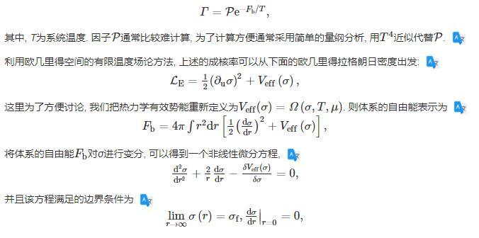 在偽真空的環(huán)境下,大小不一的真真空泡泡,由于量子漲落和熱漲落隨機(jī)出現(xiàn)并消失,直至泡泡的半徑大于等于臨界半徑,然后這些泡泡就會一直膨脹下去,完成一級相變的相變過程,并把多余的體系自由能以相變潛熱的形式釋放到環(huán)境中?;谶@個(gè)機(jī)制,單位時(shí)間單位體積的臨界泡泡成核率可以表示為