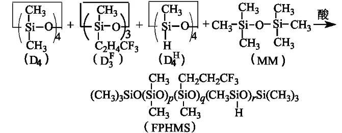 在裝有攪拌器、溫度計(jì)、回流冷凝管的四口燒瓶中,按n(D4)∶n(D3F)∶n(D4H)∶n(MM)=1∶1∶1∶1比例依次加入D4、D3F、D4H、MM,攪拌下加熱升溫至50——60℃,緩慢加入濃H2SO4(占單體總的質(zhì)量分?jǐn)?shù)3%),控溫在50——60℃反應(yīng)4 h.后升溫至80——90℃,加適量Na2CO3,反應(yīng)數(shù)小時(shí),使體系pH近5——6,冷卻,靜置,抽濾,得無(wú)色透明液體,即中間體含氟含氫聚硅氧烷(FPHMS),其含Si-H基的氫質(zhì)量分?jǐn)?shù)為0.343%.反應(yīng)式為: