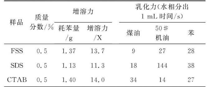 增溶力和乳化力也是表面活性劑的重要性能指標(biāo),表2列出了FSS的乳化力和增溶力測試結(jié)果,并與SDS、CTAB的性能進(jìn)行對(duì)比。