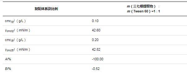 由前文實驗結(jié)果可知,三七根提取物與Tween 60的cmc均為0.1 g/L。根據(jù)2.3.2中方法,確定了三七根提取物與Tween 60復配質(zhì)量比為1∶1。在25℃下,復配體系理論值和表觀值如表3所示。三七根提取物與Tween 60的復配體系形成膠束的能力減效100%,降低溶液表面張力的能力減效0.51%。結(jié)果表明,三七根提取物與Tween 60按1∶1質(zhì)量比復配后,并不能對體系產(chǎn)生明顯的協(xié)同增效作用,這可能與三七根提取物和Tween 60的含量、結(jié)構(gòu)有關(guān)。