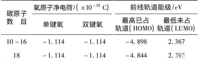 由表2可知,對于18個(gè)碳鏈的脂肪酸,碳鏈不飽和度對藥劑的價(jià)鍵特性影響明顯。碳鏈的不飽和度對分子最高已占軌道能級(jí)和最低未占軌道能級(jí)均有明顯影響,但不影響氧原子的凈電荷。