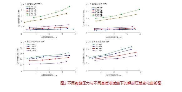 式中Δp表示解封壓差,MPa;Lw表示水封段塞長度,cm;pf表示裂縫壓力,MPa;K表示基質(zhì)滲透率,mD。