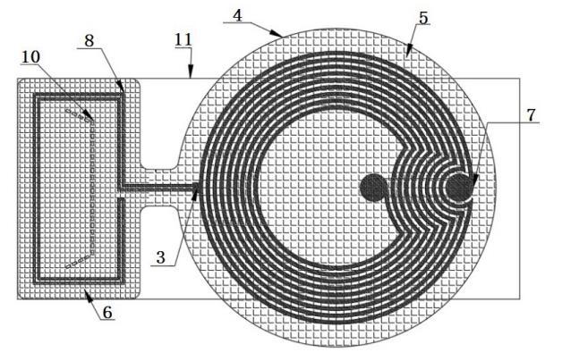 作為本發(fā)明的一種優(yōu)選技術(shù)方案:若射頻芯片為具有偵測功能的射頻芯片,則由射頻芯片的射頻端口連接布設于承載基材表面的第一走線,由第一走線在承載基材其中一端的表面上構(gòu)成射頻輻射結(jié)構(gòu),并且由射頻芯片的偵測端口連接布設于承載基材表面的第二走線,由第二走線在承載基材另一端的表面上構(gòu)成偵測結(jié)構(gòu);