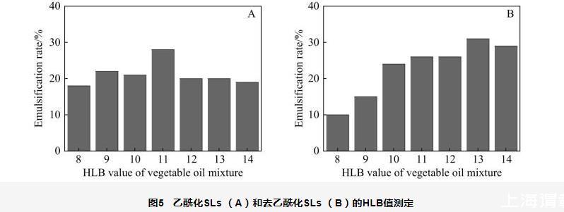 圖5乙酰化SLs(A)和去乙?;疭Ls(B)的HLB值測(cè)定