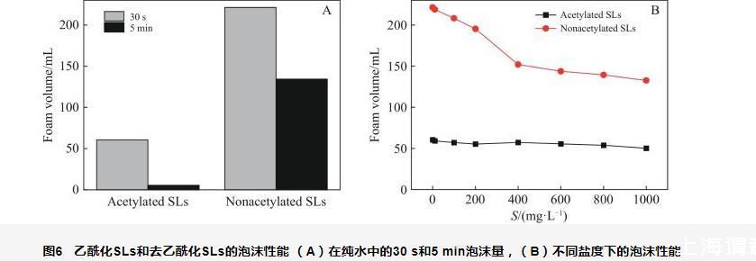 圖6乙?;疭Ls和去乙?;疭Ls的泡沫性能(A)在純水中的30 s和5 min泡沫量,(B)不同鹽度下的泡沫性能