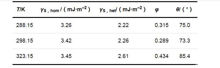 兩種成核機制時的固-液界面張力(γS,hom和γS,het)、形狀因子(φ)和接觸角(θ)的計算結(jié)果列于表2.可以看出,在同一溫度下,均相成核時的固-液界面張力大于非均相成核時的固-液界面張力;溫度對固-液界面張力的影響并不明顯,固-液界面張力只隨溫度的升高略有增加.