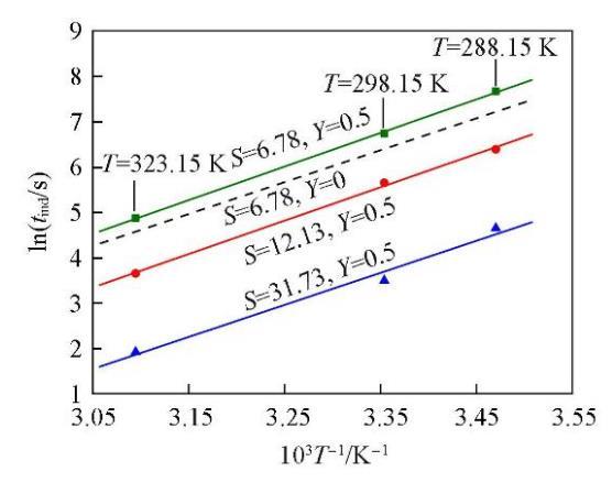 分別在288.15,298.15和323.15 K時研究了NaCl的添加對Li2CO3成核誘導期的影響,每組實驗均在Cl?的超額含量(Y=0.5)的條件下進行,結(jié)果見圖4.可知,在同一溫度下,Li2CO3的成核誘導期仍然隨過飽和度的增大而縮短;在同一過飽和度下,Li2CO3的成核誘導期隨溫度的升高而縮短,而且在添加NaCl(Y=0.5)后,溫度對Li2CO3成核誘導期的影響比未添加(Y=0)時更為顯著.如,在過飽和度S=5.76,溫度從288.15 K升高到323.15 K時,添加NaCl后Li2CO3的成核誘導期縮短了73.01%,而未添加NaCl時Li2CO3的成核誘導期縮短了67.89%.
