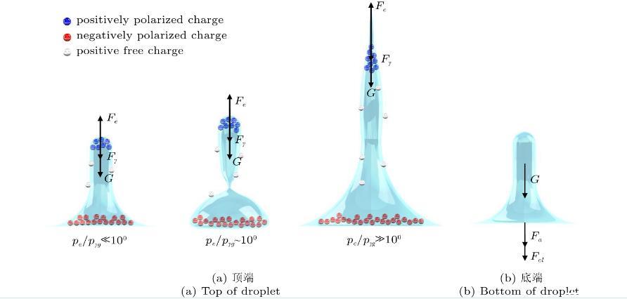 圖4(a)為液滴頂端所受力的方向和液滴整體電荷分布。液滴接觸下極板后,由于離子遷移和極化電荷的產(chǎn)生,中性液滴立即極化,其頂部帶正電荷,底部帶負電荷。根據(jù)庫倫定律,電場方向垂直向上,作用在液滴頂部的靜電力Fe是向上的,與電場方向相同,使液滴不斷向上拉伸,液滴拉伸高度增加,而表面張力Fγ和重力G使液滴向下收縮?;谏鲜龅姆治?,各個模態(tài)的產(chǎn)生機理均可通過靜電力、表面張力和重力三者間的博弈關(guān)系來分析。三種作用力對液滴的影響大小可用局部靜電應(yīng)力pe、毛細應(yīng)力pγ和重力應(yīng)力pg來表示。靜電力的大小由麥克斯韋應(yīng)力張量T的散度給出,可表示為