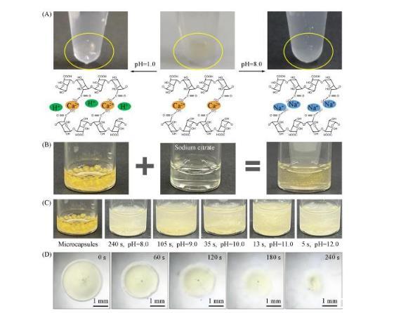 所制備的水/水微囊具有良好的生物相容性、尺寸均一性及較高的包裹率和裝載率,是各種活性物質(zhì)的理想載體,并且能夠?qū)H變化做出響應(yīng),實(shí)現(xiàn)可控釋放。如圖5(A)所示,水/水微囊的殼層是由二價鈣離子交聯(lián)的海藻酸鈉水凝膠組成,在酸性環(huán)境下具有良好的穩(wěn)定性,但在堿性環(huán)境下海藻酸鈉水凝膠與二價鈣離子的結(jié)合能力變?nèi)?,交?lián)網(wǎng)絡(luò)被破壞,從而釋放內(nèi)核活性物質(zhì)。如果在溶液中加入檸檬酸鈉,二價鈣離子更傾向于與檸檬酸根結(jié)合,從而破壞交聯(lián)網(wǎng)絡(luò),也可以溶解水/水微囊。如圖5(C)所示,水/水微囊的溶解速率隨pH的增大而提高。當(dāng)水/水微囊的囊壁被溶解后,內(nèi)核物質(zhì)逐漸被釋放出來,展現(xiàn)出良好的pH響應(yīng)性和可控釋放。