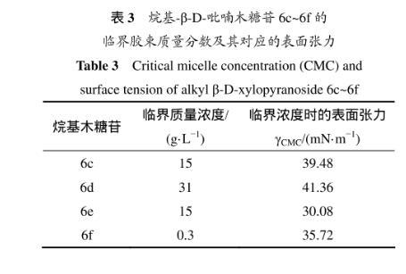 表3所示為烷基-β-D-吡喃木糖苷6c~6f的臨界質(zhì)量分?jǐn)?shù)及所對應(yīng)的表面張力。溶液表面的吸附量達(dá)到飽和時(shí)(剛好飽和時(shí)的濃度即為臨界濃度),表面張力最小。從表3可以看出:辛基-β-D-吡喃木糖苷(6e)達(dá)到臨界濃度時(shí)對應(yīng)的表面張力是最低的,能力最強(qiáng)。因?yàn)橥榛咎擒盏谋砻婊钚允怯善溆H水糖基和疏水烷基鏈共同決定,當(dāng)烷基鏈長為=8(糖苷6e)時(shí),親水性和疏水性達(dá)到最佳平衡,表面張力最低。