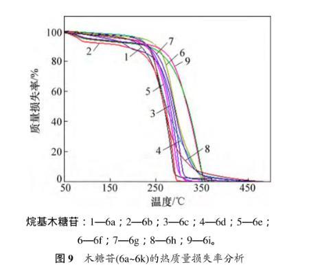 圖9所示為熱質(zhì)量損失結(jié)果。從圖9可見:烷基吡喃木糖苷6a~6i均只有1個質(zhì)量損失臺階,起始分解溫度分別為157.9,177.3,172.6,162.3,164.1,169.5,151.7,170.4和208.9℃左右,最大分解速率時的溫度依次為283.2,287.8,296.6,257.9,290.4,286.1,301.9,262.7和339.8℃。糖苷6a~6i熱分解完時的溫度分別為303.1,298.1,329.6,365.5,320.4,340.2,332.0,374.6和356.2℃??傎|(zhì)量損失率為94.9%,89.9%,91.0%,91.9%,95.3%,96.6%,89.6%,88.5%和91.5%。結(jié)果表明:合成的烷基吡喃木糖苷在150℃以下是穩(wěn)定的。