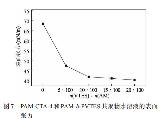 從圖7可以看出,隨著VTES用量的增大,共聚物水溶液的表面張力逐漸降低,n(VTES)∶n(AM)由0增加到10∶100時(shí),共聚物水溶液表面張力從68.49 mN/m降低到40.44 mN/m,繼續(xù)增大VTES用量,共聚物水溶液表面張力逐漸趨于穩(wěn)定。這說(shuō)明VTES和AM共聚后賦予了共聚物水溶液更低的表面能,降低了共聚物水溶液的表面張力。