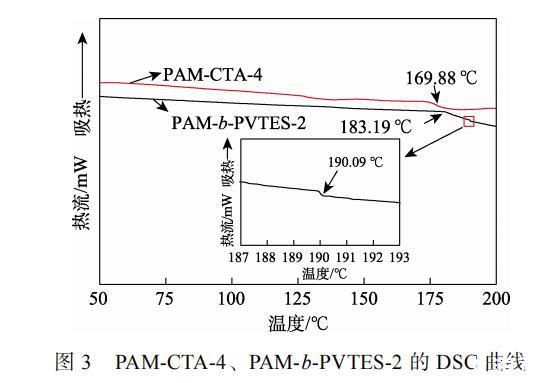 圖3為PAM-CTA-4、PAM-b-PVTES-2的DSC曲線(xiàn)。從圖3可以看出,PAM-CTA-4只有一個(gè)玻璃化轉(zhuǎn)變溫度(Tg),為169.88℃,但是PAM-b-PVTES-2有兩個(gè)Tg,分別為183.19和190.09℃,分別對(duì)應(yīng)了聚丙烯酰胺(PAM)和聚乙烯基三乙氧基硅烷(PVTES)的Tg。PAM和PVTES鏈段間存在一定的相互作用,這些相互作用導(dǎo)致嵌段共聚物中兩相的Tg與各自均聚物的Tg不同,兩相的相互作用(融合)導(dǎo)致Tg向兩者之間移動(dòng)。由此可知,合成的聚合物具有兩相結(jié)構(gòu),屬于嵌段共聚物。