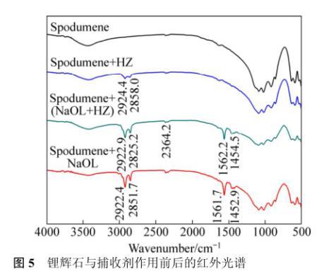 鋰輝石與不同藥劑作用前后的紅外光譜如圖5所示,鋰輝石與NaOL作用后在2922.4和2851.7 cm?1波長處都有峰存在,在此波長范圍內(nèi)為甲基(—CH3)、亞甲基(—CH2—)的伸縮振動(dòng)共振峰,表明NaOL在鋰輝石表面有吸附作用。在1561.7和1452.9 cm?1波長處有新峰產(chǎn)生,其中1452.9 cm?1波長處為亞甲基(—CH2—)的變形振動(dòng)共振峰,1561.7 cm?1處為油酸鋁的吸收峰,表明NaOL在鋰輝石表面生成了新的物質(zhì),新峰產(chǎn)生表明這種吸附作用是化學(xué)吸附。鋰輝石與HZ作用后在2924.4和2858.0 cm?1波長處都有峰存在,在此波長范圍內(nèi)為甲基(—CH3)、亞甲基(—CH2—)伸縮振動(dòng)共振峰,表明HZ在鋰輝石表面有吸附作用。而鋰輝石與HZ藥劑作用后,光譜圖譜中沒有新峰產(chǎn)生,表明這種吸附不是化學(xué)吸附,HZ是一種非離子型捕收劑,它在鋰輝石表面的吸附不是靜電吸附,結(jié)合Zeta電位結(jié)果分析推測這種吸附可能是氫鍵作用。鋰輝石與(NaOL):(HZ)=5:1組合捕收劑作用有新的峰產(chǎn)生,但仍是和鋰輝石與NaOL作用后的吸收峰類似,表明捕收劑經(jīng)過組合后,HZ并沒有和NaOL生成新的物質(zhì)從而改變吸收峰的位置。