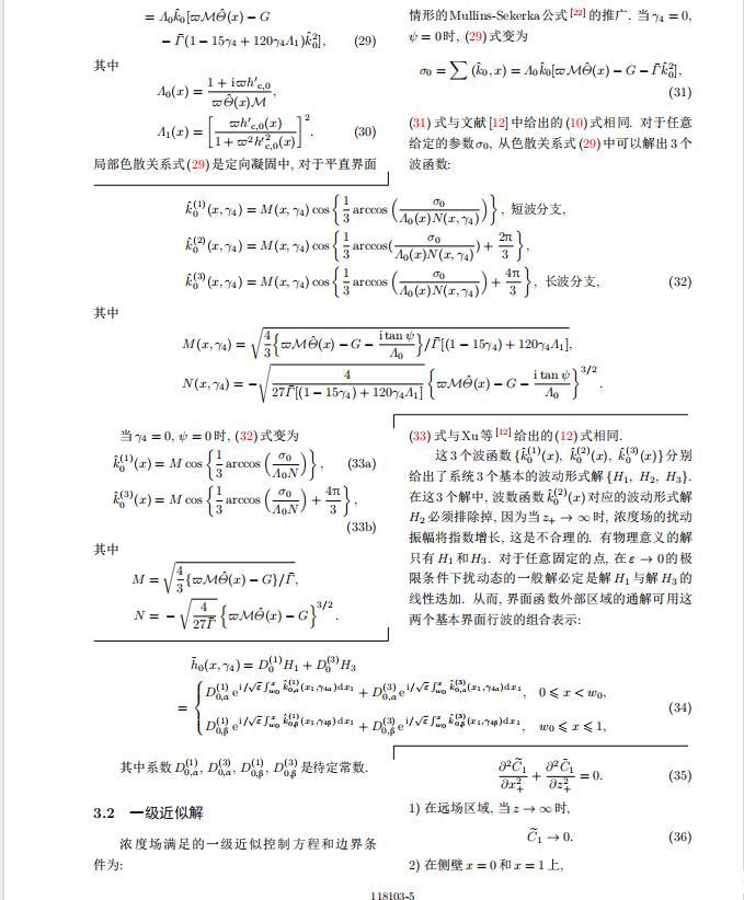 將系統(tǒng)方程以振幅遠(yuǎn)小于1進(jìn)行線性化處理,結(jié)合(1)式—(4)式,可以得到共晶生長(zhǎng)系統(tǒng)的擾動(dòng)態(tài)滿足以下控制方程和邊界條件: